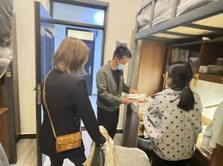 2022年3月23日,2026世界杯指定网站张学高经理带领王婷、杨雅楠等辅导员走访宿舍,对同学们在疫情期间上网课学习情况,生活情况、心理情况等进行慰问。