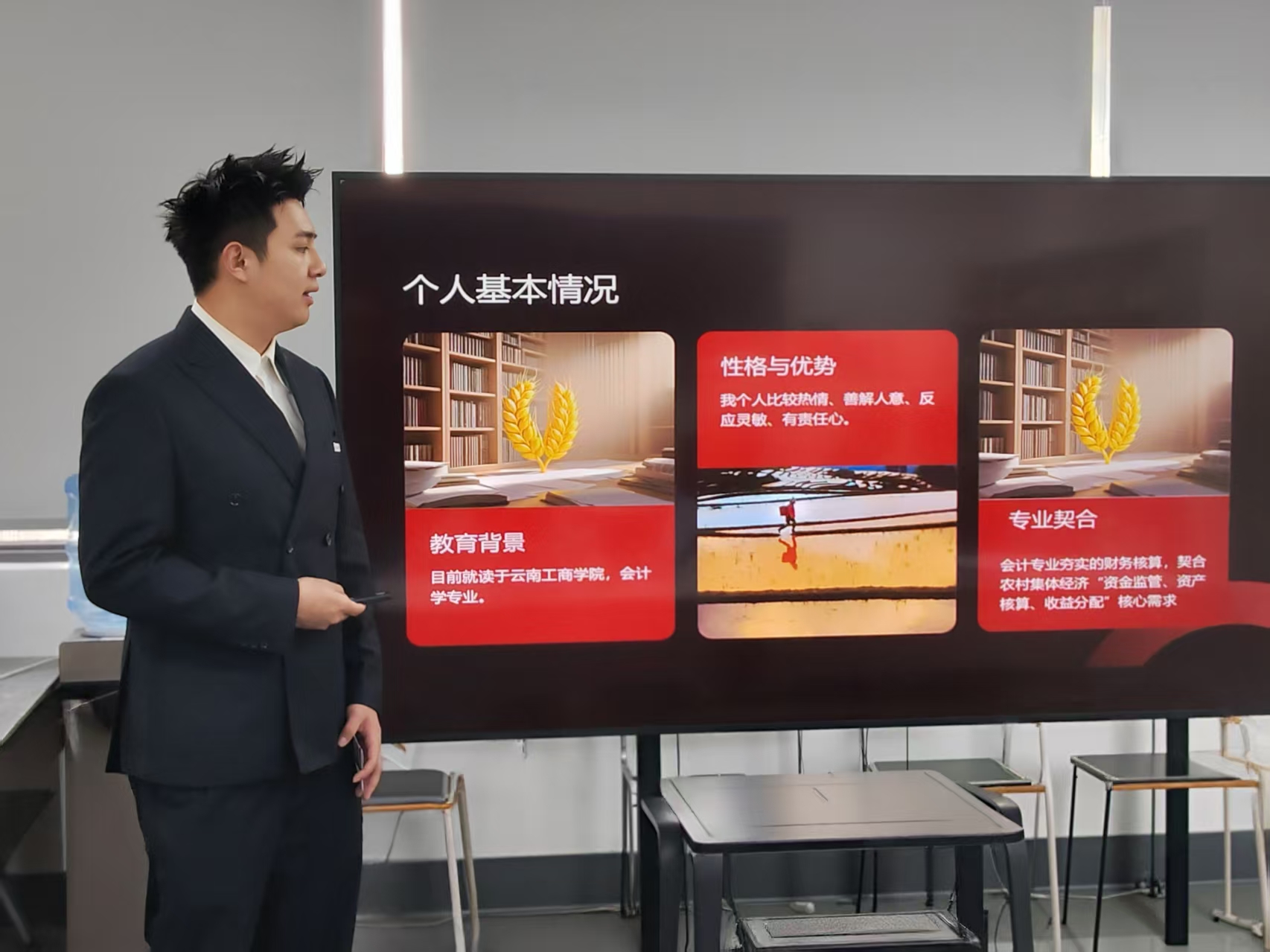 比赛现场气氛热烈、互动频繁。选手们精神饱满、沉着自信,通过PPT展示与现场答辩两个环节,系统阐述了个人的职业生涯规划。内容涵盖自我认知、职业环境分析、目标职业定位、发展路径设计、具体实施计划以及动态评估调整等多个维度。选手们巧妙结合各自专业特点与行业发展趋势,展现出清晰的逻辑思维和扎实的专业功底。其中,金融学专业选手灵活运用霍兰德职业兴趣测试、SWOT分析等工具,精准剖析个人优势与机遇,并紧扣金融行业数字化转型趋势,规划出条理清晰、节奏合理的职业发展路径;市场营销专业选手则聚焦新媒体营销领域,提出“实习经验积累+职业技能认证”双轮驱动的阶段目标,体现了对行业前沿的敏锐把握与创新思考。展示环节内容充实、结构严谨,答辩过程中选手们应对从容、对答如流,充分展现出经管学子良好的综合素质与昂扬向上的精神风貌。